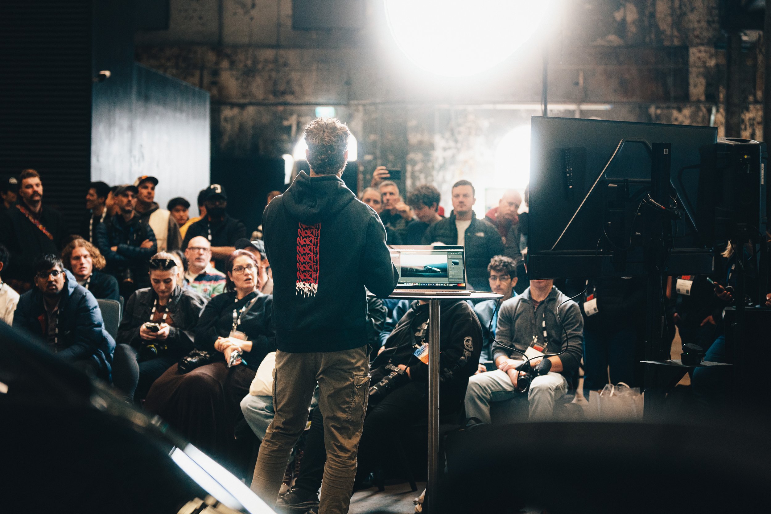 Shoulders of other shooters in the foreground, studio lighting in the background, the creatives themselves, the keynote speakers — the small rituals, gestures, and transitions that reveal the character of an event.